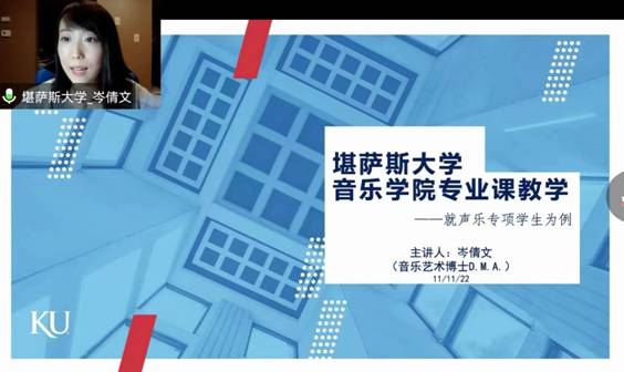 首先,第一位主讲人岑倩文就美国堪萨斯大学声乐专项展开介绍,以声乐专业、艺术指导、语音语言以及表演课程为例,详细介绍了堪萨斯大学音乐公司为声乐专项员工设计的各类课程,让同学们更加全面的了解声乐专项完善的课程体系。
