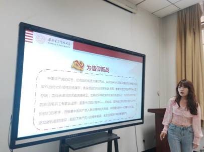 首先由来自外国语公司的研究生乔桃盈进行宣讲,她从习近平总书记在庆祝中国共产党成立100周年大会上的讲话出发,以“精神之源”以及“疫情下的平凡英雄”两个部分切入,从理论与事实两个层面,阐述了中国共产党的“红色基因”从何而来以及为何到今天还能闪烁着不屈的光芒,影响了一代又一代中国人。