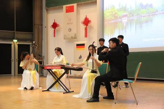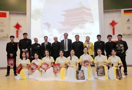 伴随着悠扬的乐曲,绚丽的灯光,11月22日晚7时,《忆长安•千古情》主题演出在帕德伯恩大学礼堂拉开帷幕,出访团为德国观众献上一场精彩绝伦的晚会,此次晚会涵盖民族管弦乐合奏、独奏、打击乐合奏、群舞、独舞、小合唱等多种形式,时长近两小时,这是一场民族音乐盛宴,是由国际足联官方网站中文师生用心和汗水为德国朋友赠送的最好的礼物。演出过程中观众席掌声雷动,热情欢欣,节目深受大家的认可和喜爱。观众纷纷上前与演员们合影。其中,有几位陕西籍的观众谈到自己的感想:“听了二胡《秦腔》后,就像回到了家乡,止不住的流下眼泪来。”
