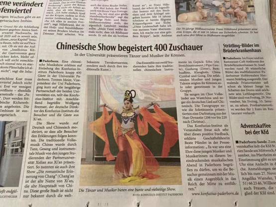 据悉,本次演出得到了德国neuewestfälischepaderborn新威斯特法伦帕德博恩红报题为“中国表演惊艳400名观众-舞者和歌唱者在大学展示了她们的才艺”报道。