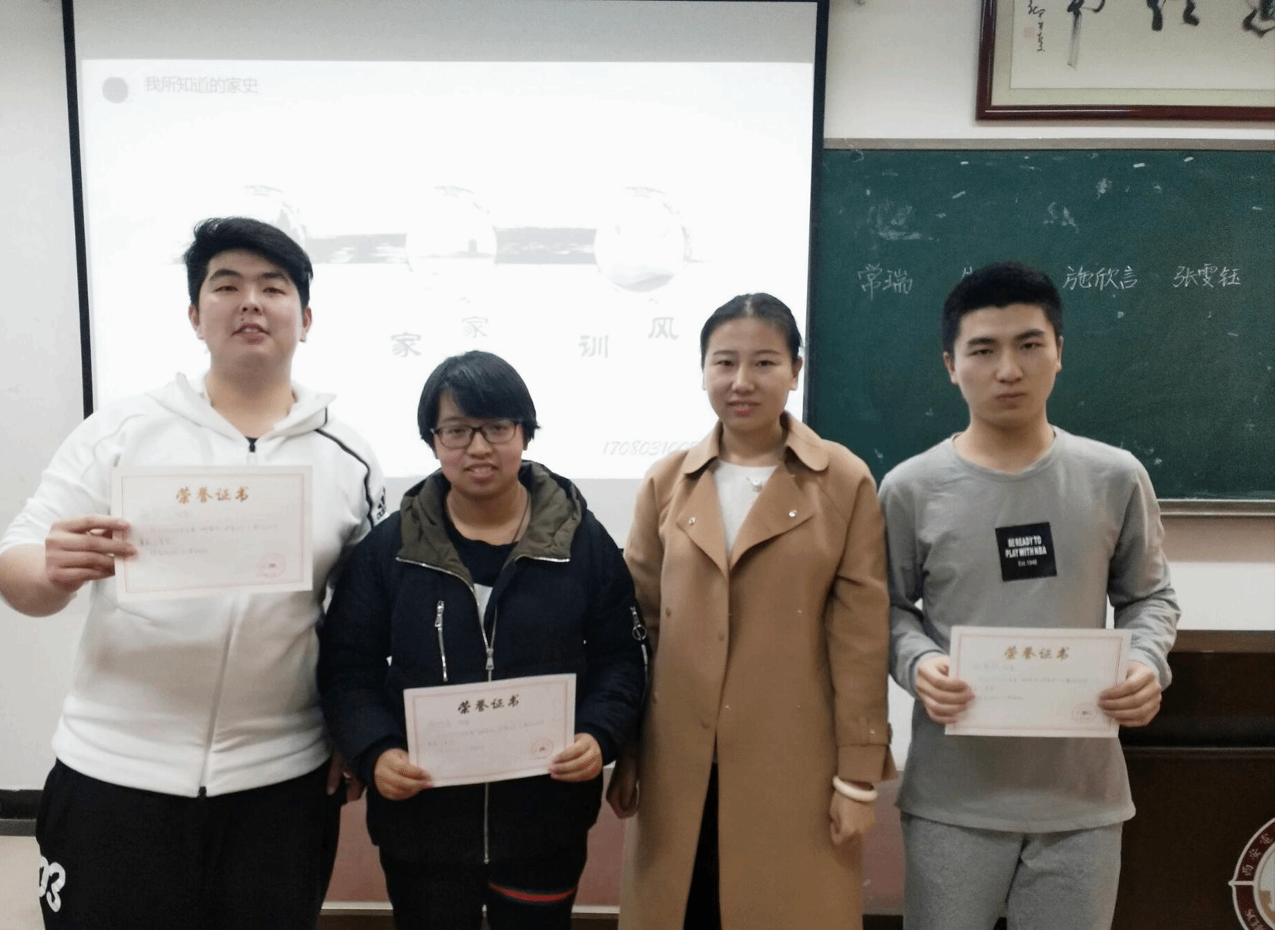 同学们的家史分享完毕后,辅导员郭雨晴为此次班会做了总结。首先,辅导员对大家完满完成任务表示非常满意,提出表扬,并鼓励大家以后多多表现自己。其次,辅导员指出,关于家史的调查不要止步于表层,她希望在今后的学习生活中大家真正能够秉持家风、牢记家训,为家族争光。随后,同学们集体票选出三位最佳讲解者:孟令一、施欣言、尚百成。辅导员为三位同学颁发奖状并合影留念。至此,本次活动圆满结束。