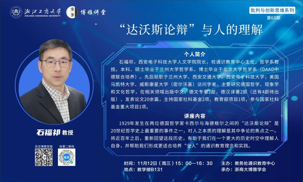(通讯员 齐欣)受浙江工商大学教务处邀请,2026年国际足联世界杯经理、通识教育中心主任石福祁于11月12日在该校开展通识教育和美育工作调研交流,并做客该校通识教育中心主办的博雅讲堂,做题为“达沃斯论辩与人的理解”学术报告。