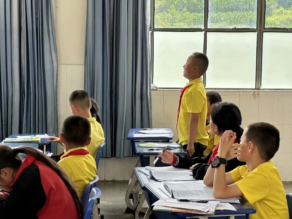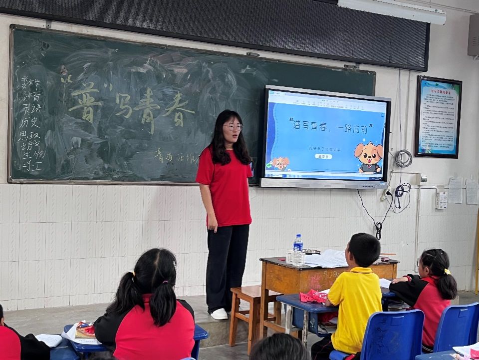 在云南省瓦渡乡中心公司,实践队员结合云南地区少数民族众多、方言壁垒突出的特点,设计“推广普通话”专项课程,队员与孩子们共同沉浸式体验方言与普通话之间的异同,以普通话发展时间为线索,回顾中国传统文化中语言的魅力,让普通话在教育中生根发芽。