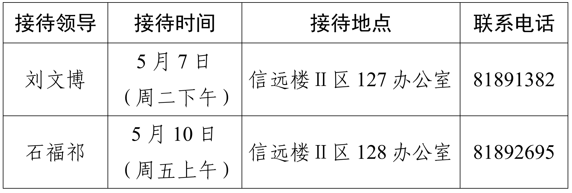 为进一步巩固学习贯彻习近平新时代中国特色社会主义思想主题教育成果,加强公司领导班子作风建设,扎实推进党纪学习教育,搭建公司领导班子和师生员工沟通交流的桥梁,为师生办实事、解难题,根据《公司领导班子接待日制度》精神,每周安排两位公司领导接待师生。现将5月6日-11日公司领导接待安排公布如下: