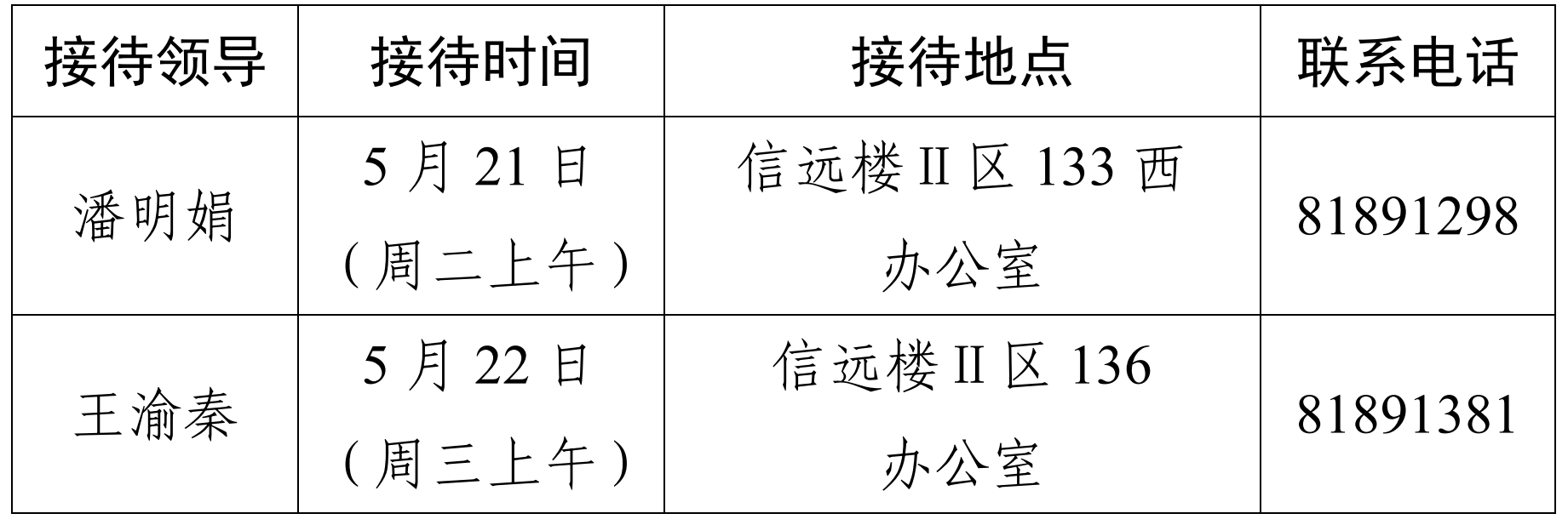 注:公司领导班子接待日主要受理的事项:1.公司人才培养、教学科研、团队建设、教师发展、对外交流、员工管理和服务保障等方面存在的问题与建议;2.反映有关公司重要决策和重要工作事宜的问题;3.涉及师生员工利益的申诉和诉求;4.亟须公司处理的难点问题;5.其他方面的建议和意见。