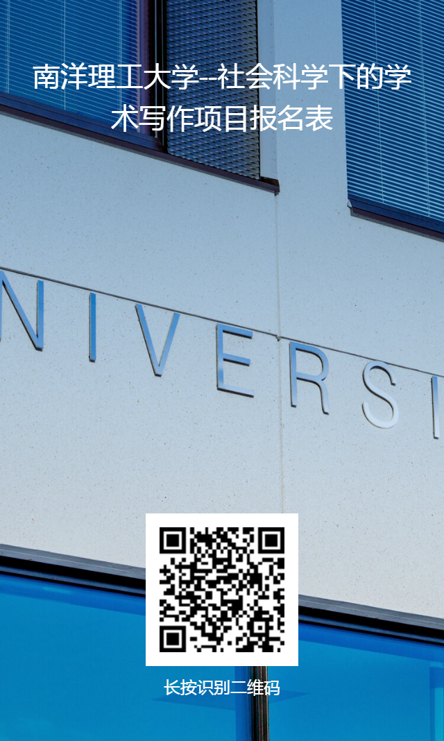 本项目是南洋理工大学设计的为期8天的线下项目,由南洋理工大学在职教授授课。项目将开设‘’学术写作目的及显著特点‘’‘’英语学术写作的基本要素‘’‘’惯例在学术写作中的作用‘’等相关主题,涵盖新加坡南洋理工大学特色专业课、小组讨论、结业项目展示等内容,最大程度地让同学在短时间体验南洋理工大学的学术特色。
