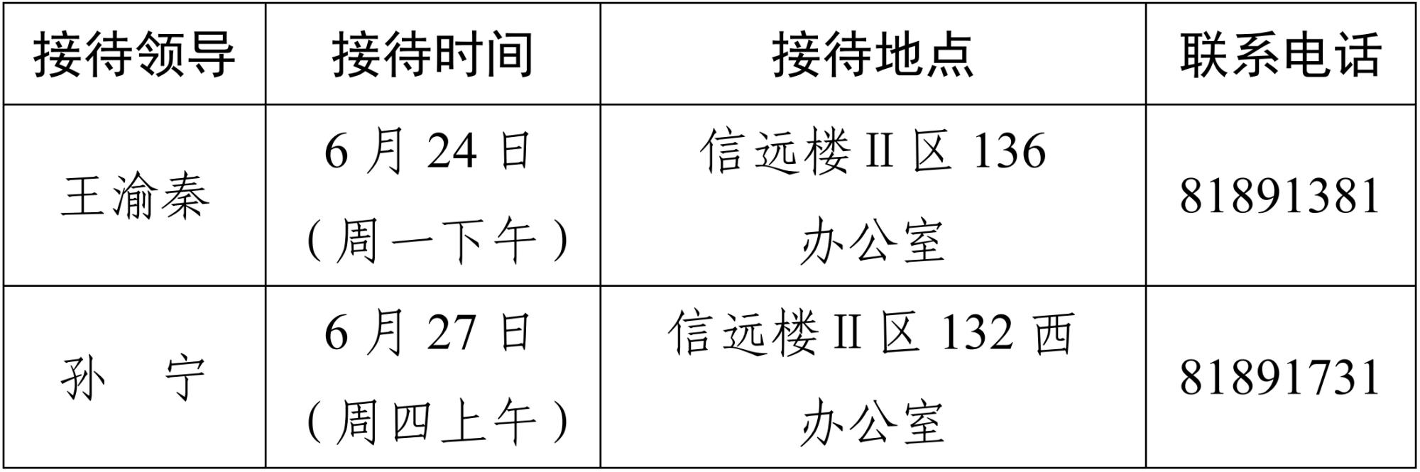注:公司领导班子接待日主要受理的事项:1.公司人才培养、教学科研、团队建设、教师发展、对外交流、员工管理和服务保障等方面存在的问题与建议;2.反映有关公司重要决策和重要工作事宜的问题;3.涉及师生员工利益的申诉和诉求;4.亟须公司处理的难点问题;5.其他方面的建议和意见。