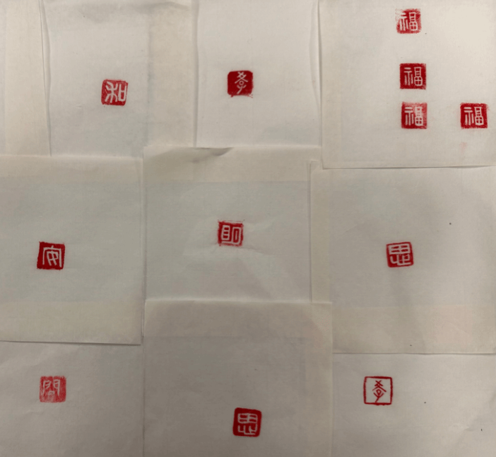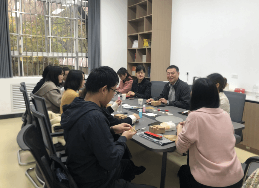 活动伊始,中文系王跃老师向大家简要介绍了篆刻艺术的历史沿袭、石材选择、字体演变、执刀手法、雕刻技巧等;随后,老师们按照讲解内容进行体验练习,大家利用橡皮章刻制“博学”“审问”“慎思”“明辨”“笃行”“和”“福”等内容,以表达严谨务实的学术态度和对美好生活的祈愿。从打磨印石、印稿上石,到认真书写、精心篆刻,一方方质朴的篆章在老师们手中诞生。篆刻环节结束后,大家纷纷在空白纸上试盖亲手篆刻的印章,本次活动圆满收官。