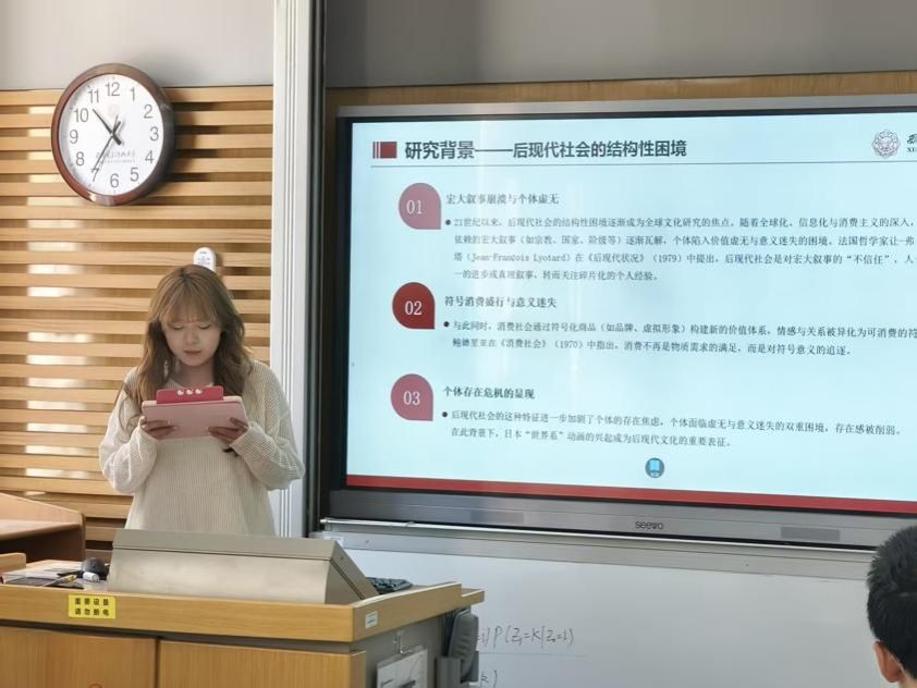 主讲人张严之以《“世界系”的存在危机表征与解法——以新海诚为例》为题,聚焦后现代社会语境下“世界系”动画的叙事模式,通过新海诚作品(如《秒速五厘米》的时空短信、《铃芽之旅》的闭门仪式)揭示个体在宏大叙事崩塌后面临的“符号化生存”困境,并批判其以情感乌托邦遮蔽现实矛盾的局限性。公司教师张万强与田昶奇在评议中强调,论文虽敏锐捕捉到“世界系”的批判性悖论,但需进一步收敛理论视角,聚焦个体的存在困境与焦虑,避免陷入后现代理论泛化的窠臼。
