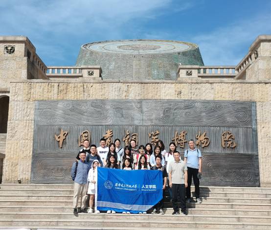 最后一站来到扶风县的宝鸡周原博物院,该馆是周原遗址大规模考古发掘基础上建立起来的一个专题性博物馆。“古公亶父,来朝走马。率西水浒,至于岐下。”周人的首领古公亶父遂率领族人离开豳,渡过漆水、沮水,翻过梁山,来到岐山之下的周原,在此处营筑城郭、宫殿、宗庙、房屋。周原遗址包括以农立国、西周都邑、手工业集聚地和建筑艺术等,彰显着周文化独特的精神气质。馆藏有周原遗址出土的万余件珍贵文物,全面地反映了三千年以前周人的生产、生活习俗以及政治、经济状况。在讲解员的讲解下同学们进一步学习和了解了厚重且意义深远周文化。